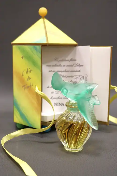 NINA RICCI. Coffret kiosque avec flacon de parfum colombe par LALIQUE à bouchon vert, collection limitée en couleur « L’Air du temps » (15ml), numéroté P898.