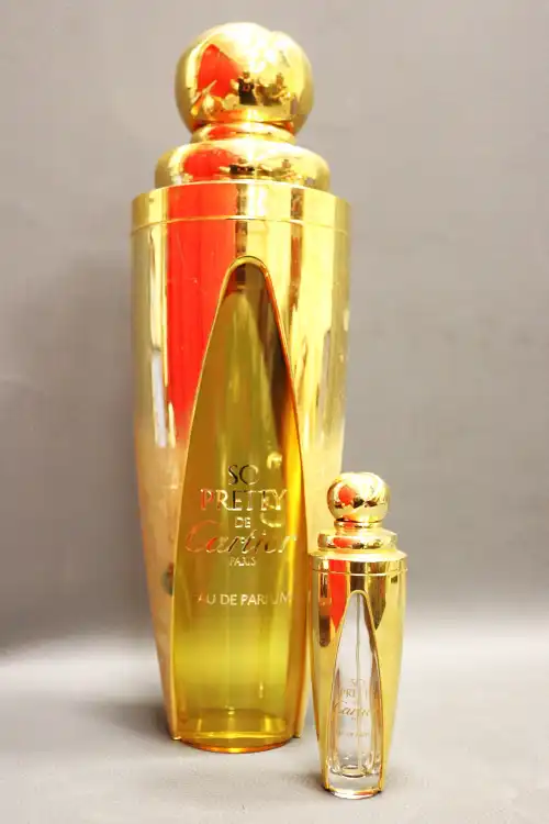 CARTIER. Ensemble de deux flacons d’eau de parfum de la collection « So Pretty » vides (100ml et factice 39cm).