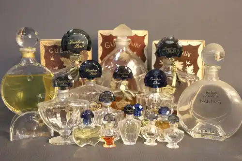GUERLAIN. Fort lot de divers flacons en verre comprenant : - LE CHANT D’AROMES. Deux flacons moyens et un plus grand ;