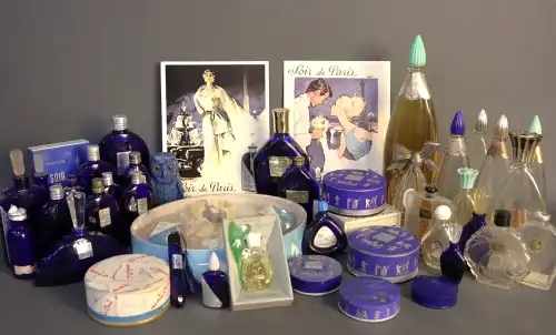BOURJOIS. Ensemble de flacons de parfums (collections "Soir de Paris", "Ramage" eau de Cologne", "Glamour", "Premier muguet", "Mon parfum", "Lotion jasmin")