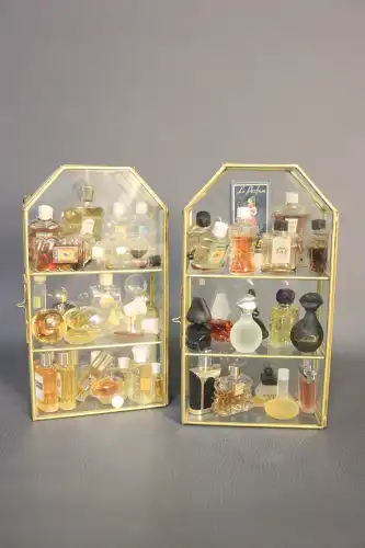 Lot de deux vitrines avec miniatures de parfums dont CARON, LE GALION, GUERLAIN, MONSAVON, MURY... H. : 23 cm