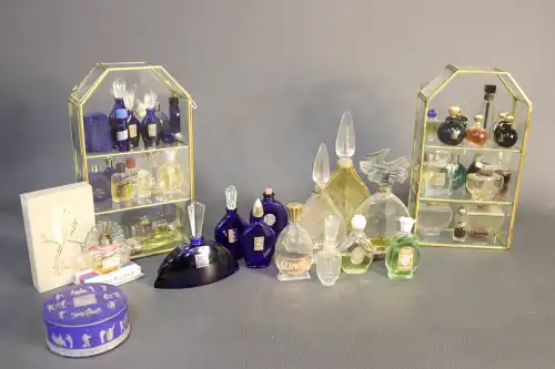 Lot de deux vitrines avec miniatures de parfums et flacons de parfums dont BOURJOIS, LANVIN, GUERLAIN, LANCOME, THIERRY MUGLER. On joint une boîte à poudre et boîte de parfum BOURJOIS. H. 23 cm