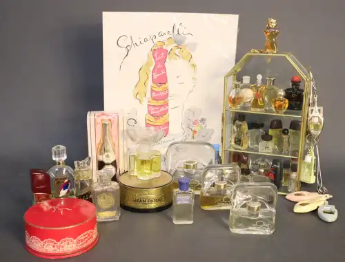 Lot de vitrine avec miniatures de parfums et flacons de parfums dont SCHIAPARELLI, JEAN PATOU, GUY LAROCHE, LENTHERIC... On joint une boîte de poudre et une affiche SCHIAPARELLI. H. 23 cm