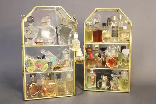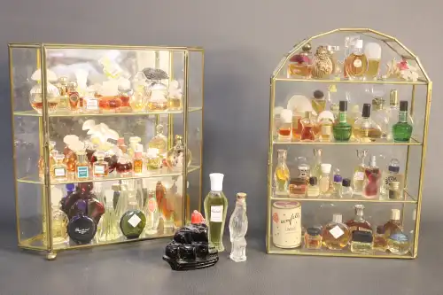 Lot de deux vitrines avec miniatures de parfums dont GIVENCHY, LE GALION, GUERLAIN, GRES...