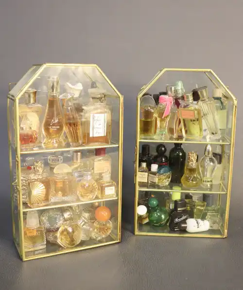 Lot de deux vitrines avec miniatures de parfums dont SALVADOR DALI, L.T PITIVER, LE GALION, FLEURS DE PARIS...*