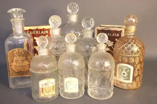 GUERLAIN. Lot de divers flacons de parfum en verre comprenant : - un grand flacon vide en verre « Eau de Guerlain » stylisée d’abeilles. Probablement 800 ml ;