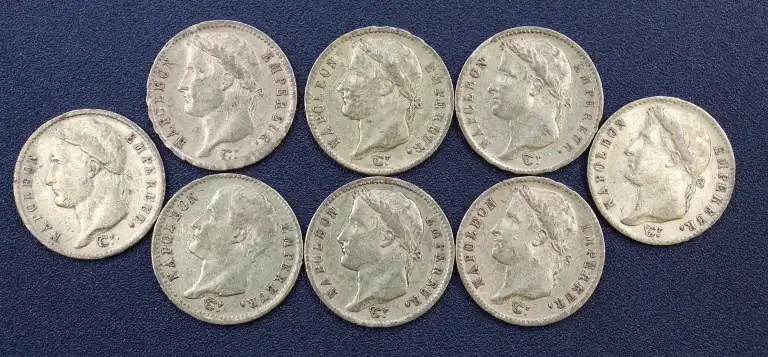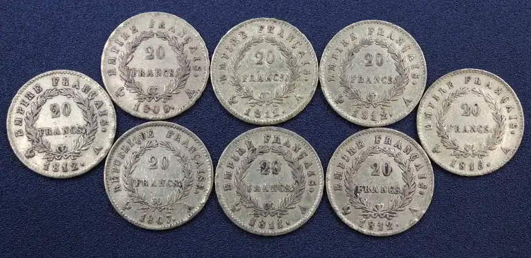 Lot de 8 pièces de 20 Francs or Napoléon Premier de 1807, 1809, 1811, 1812 (4) et 1815.