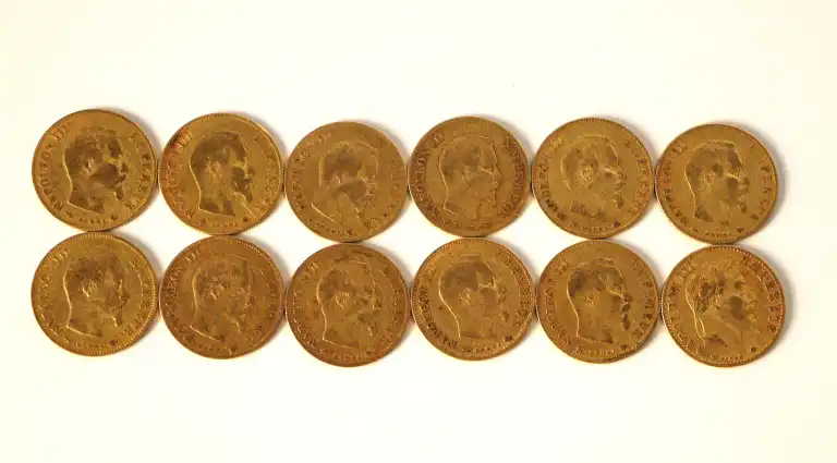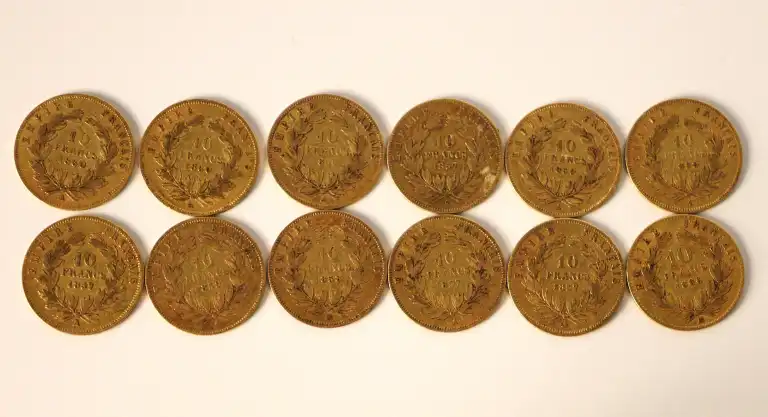 Lot de 12 pièces de 10 Francs or Napoléon III : 1856, 1857 x 4, 1858, 1859 x 3, 1860 x 2 et 1866.