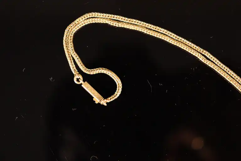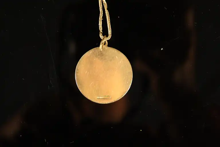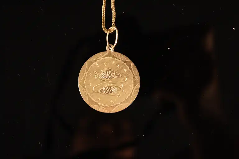 Médaille ronde en or jaune 18 K (750) à motif de deux poissons et chaîne en or jaune 18 K (750). Poids : 10.46 g