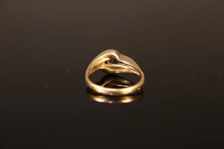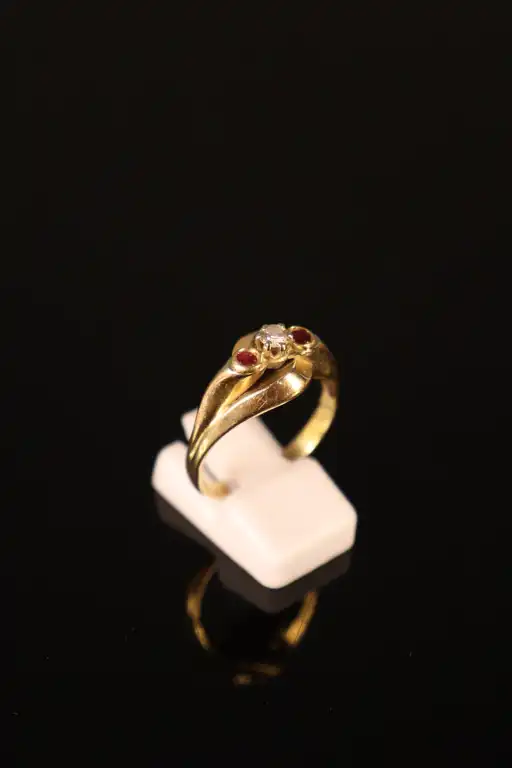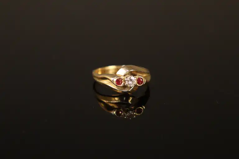 Bague en or jaune 18 K (750) sertie d'un diamant taille briallant entouré de deux rubis. TDD: 60. Poids brut : 5.05 g