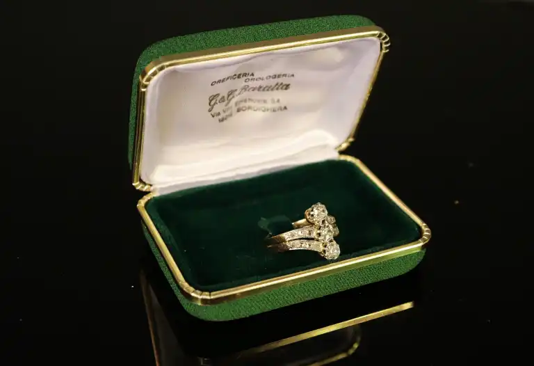 Bague en or jaune et gris 18 K (750) sertie de trois diamants alignées taille ancienne d'environ 0.3 carat chacun et de lignes de petits diamants taillés en rose sur une monture à double anneau. Poids brut : 5.9 g (Deux roses manquantes)