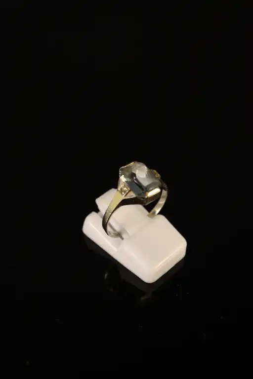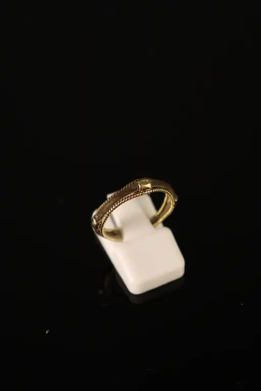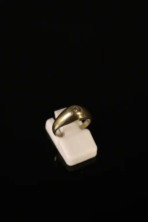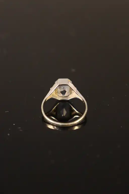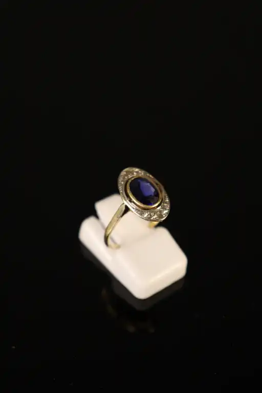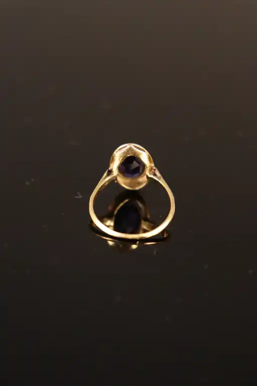 Lot de bagues en or 18 K (750) : deux bagues serties d'une pierre bleue, un anneau, une bague ornée d'un poil d'éléphant et bague sertie d'un petit diamant. Poids brut : 14.15 g