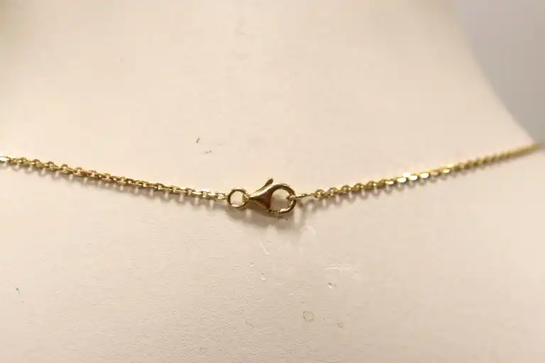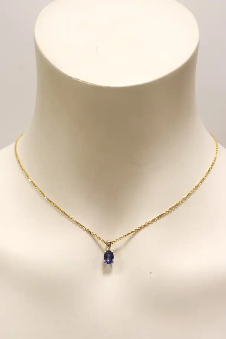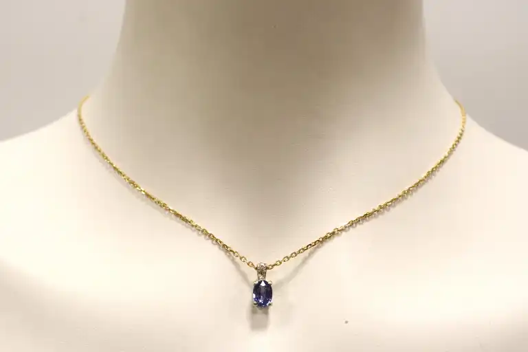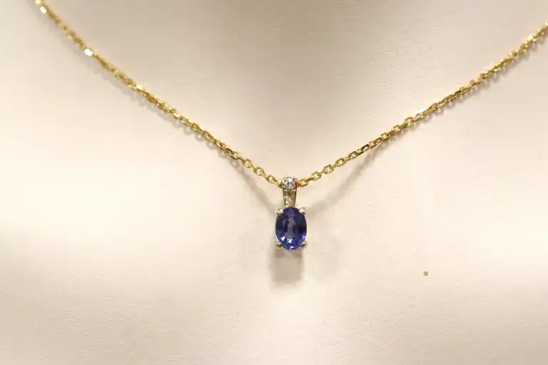 Pendentif en or gris 18K (750) orné d'un saphir ovale calibrant environ 1,10 ct (pierre probablement traitée thermiquement, légère rayure sur la table), en serti 4 griffes, la bélière ornée de 2 diamants taille brillant (un manquant). Il est retenu par une chaîne en or jaune 18K (750 maille forçat. Poinçon de M-O "Sté V" sur le pendentif. Poids brut : 4,4 g. Chaîne à charge de contrôle.