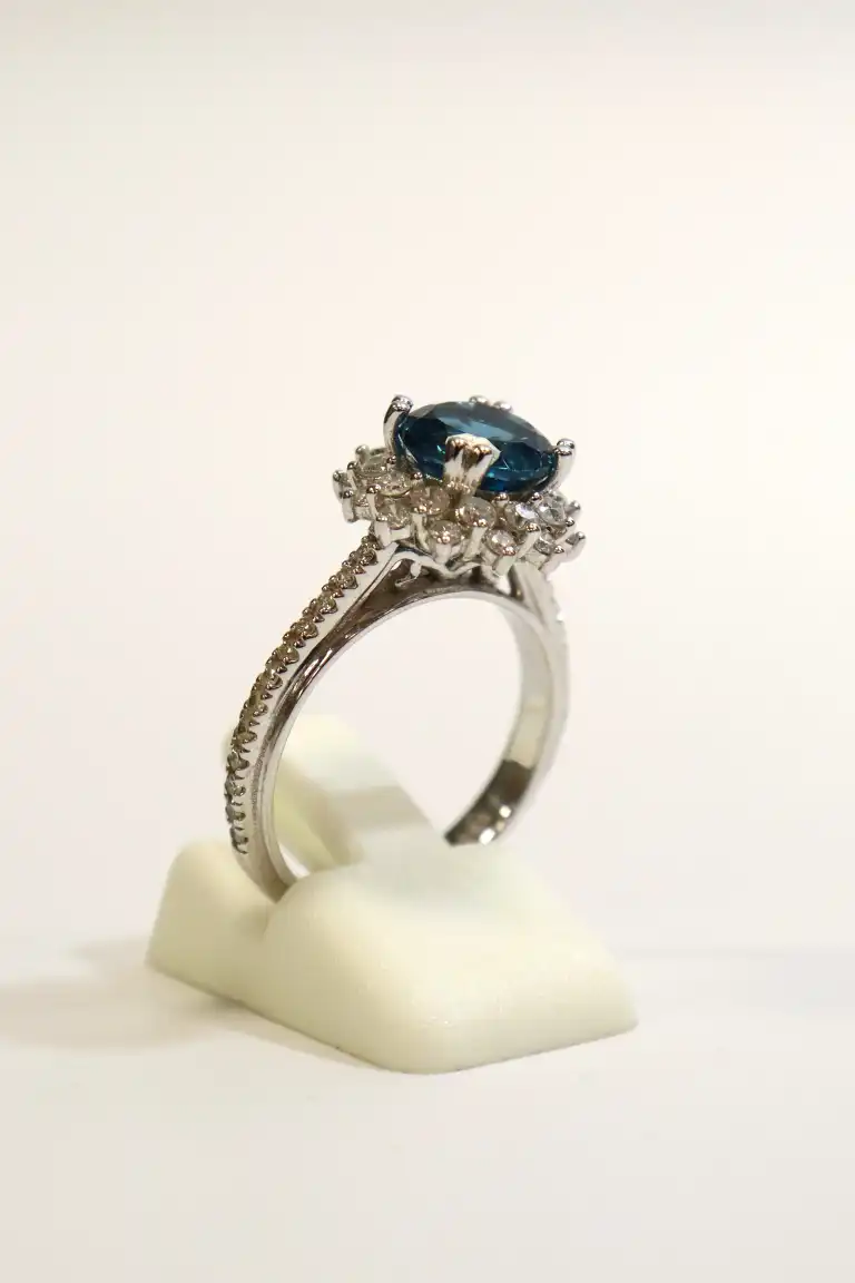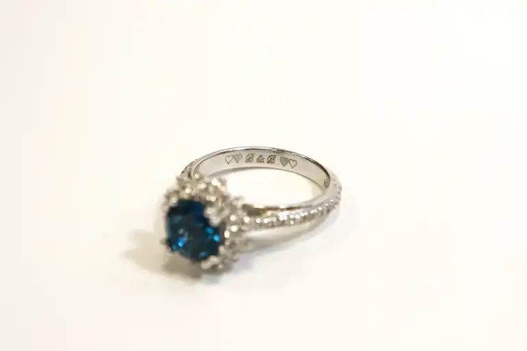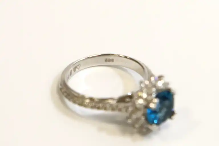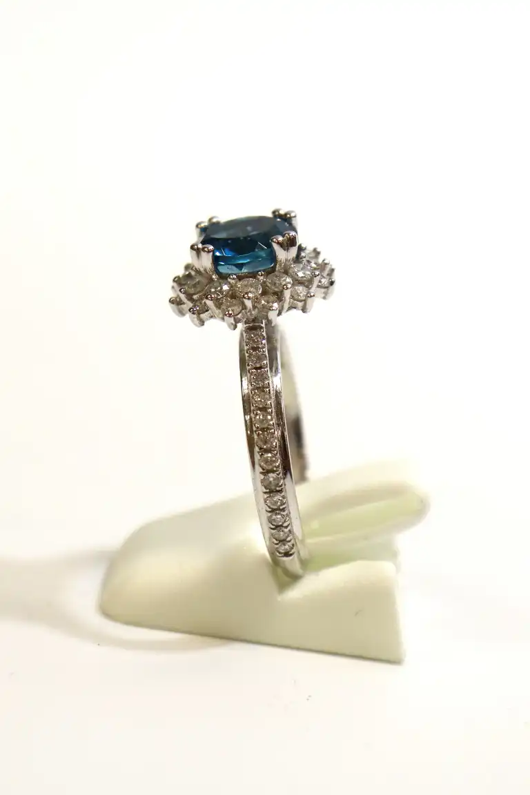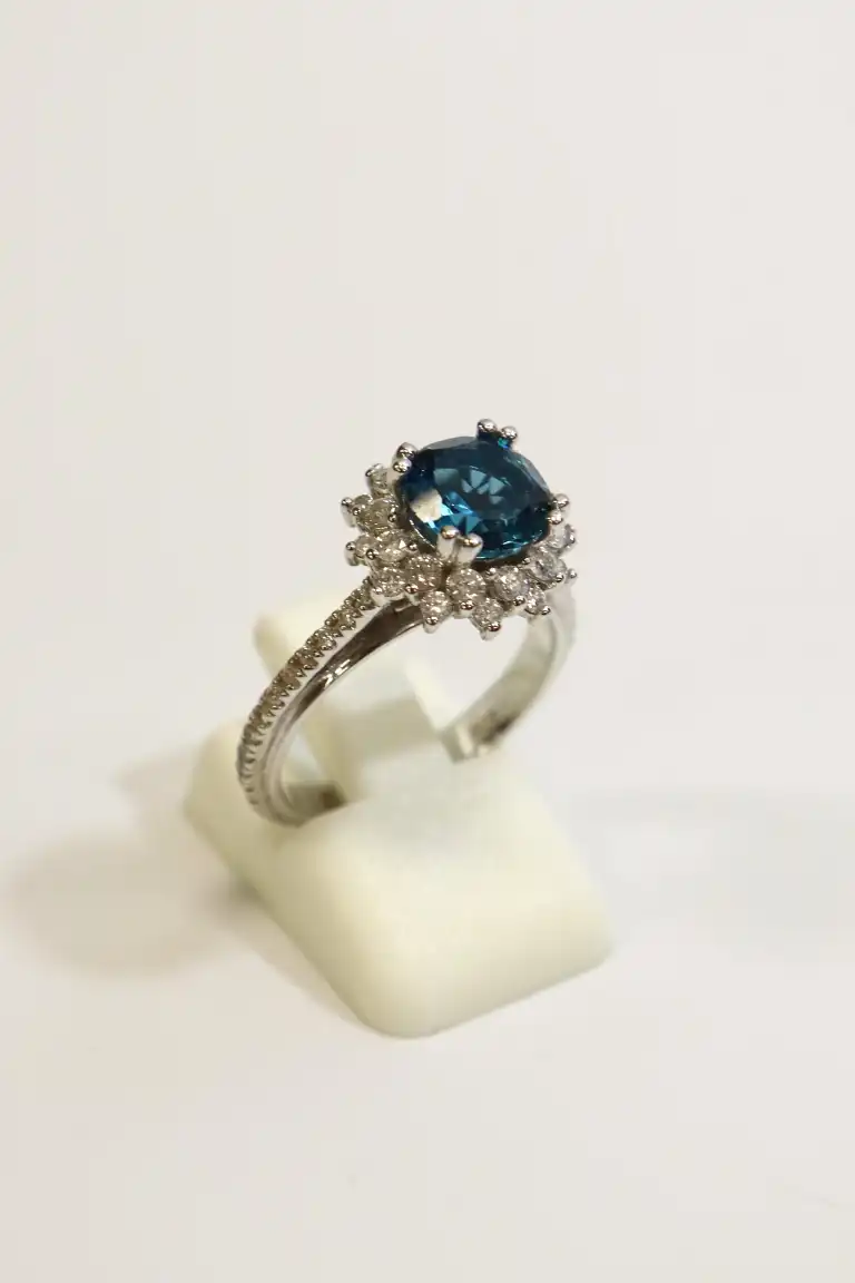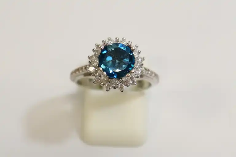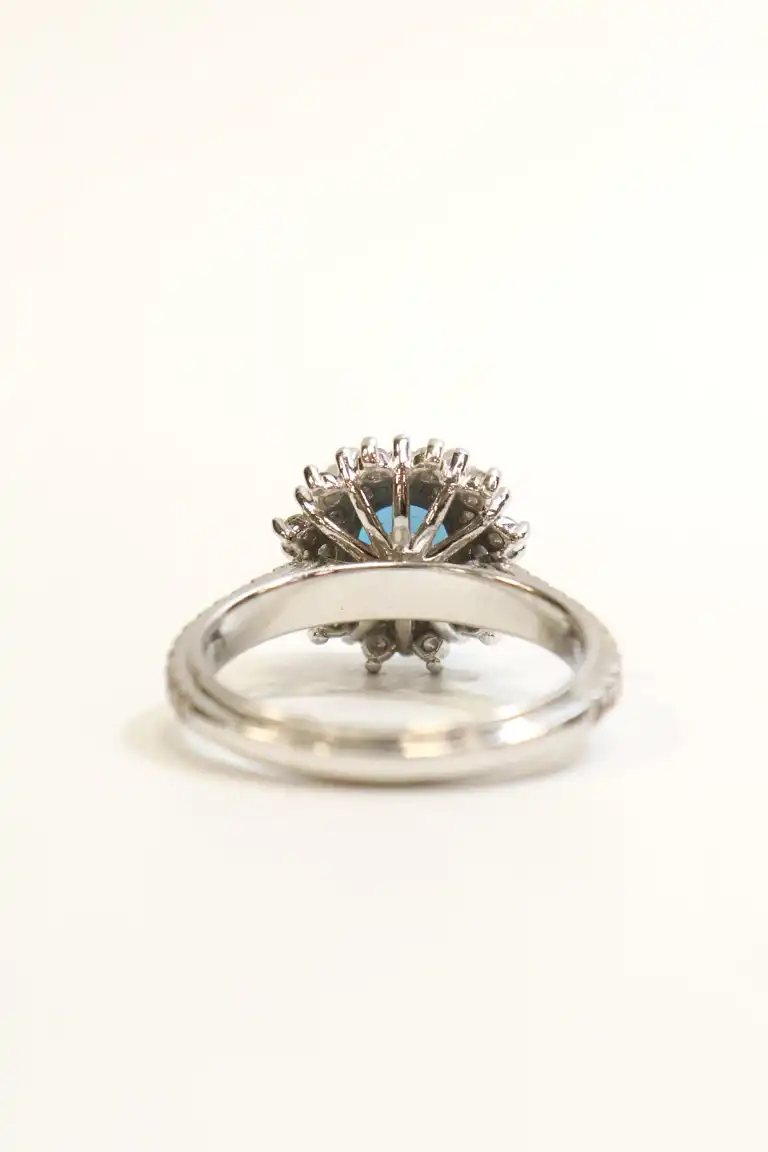 Bague en or gris 14K (585), centrée d'une topaze bleue ronde (pierre traitée), l'entourage et les attaches sertis de diamants taille brillant (infimes accidents). Anneau dédicacé à l'intérieur. TDD 54. Poids brut : 5,4 g. A charge de contrôle