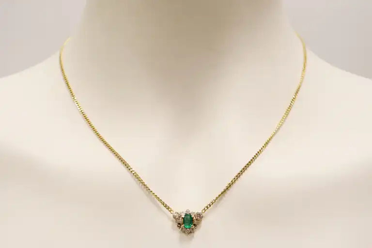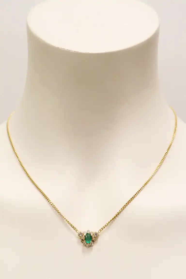 Collier en or jaune 18K (750) à maille gourmette, le motif central orné d'une émeraude ovale (usures et fêles affleurants, traces de résine possibles) dans un entourage de diamants taille brillant et taille tapers. Poids brut : 6 g.