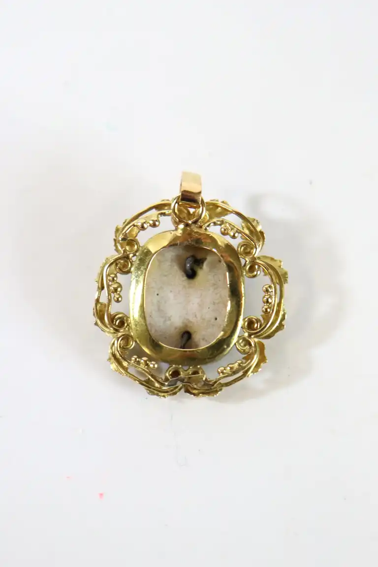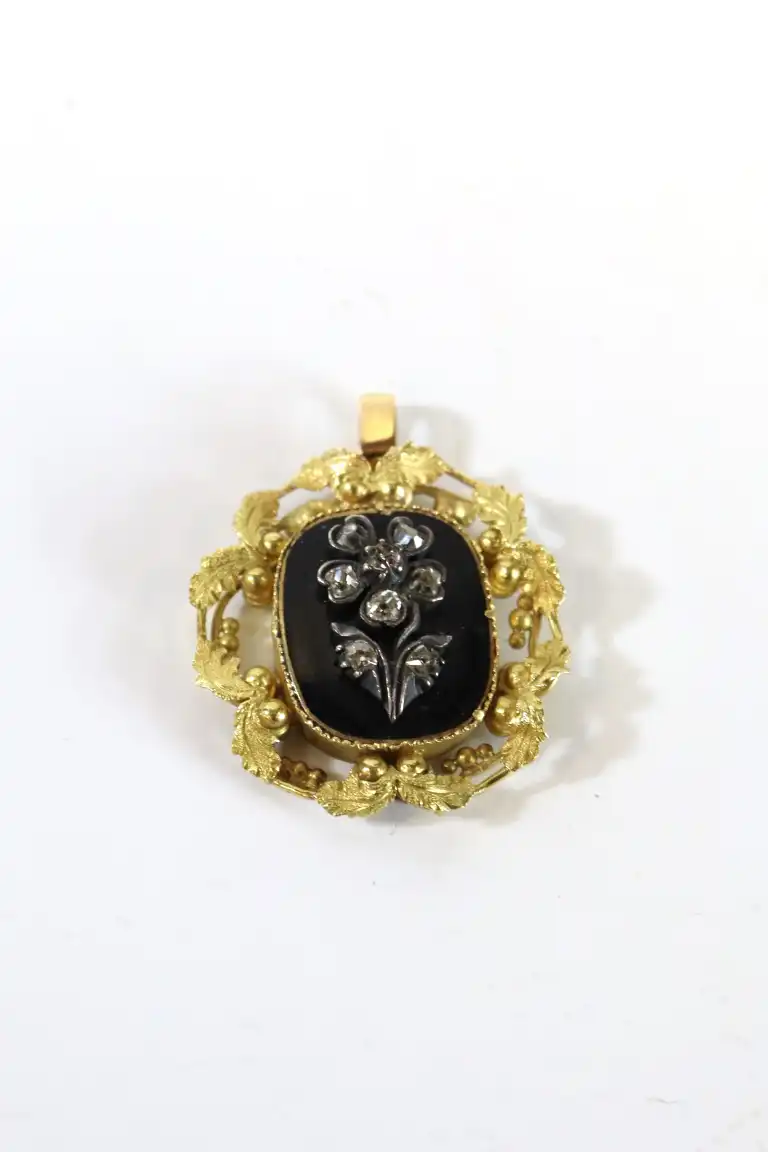 Pendentif en or jaune 18 K (750) orné d'une rose sertie de brillants sur fond émaillé noir. Poids brut : 4.6 g