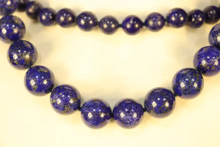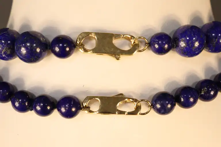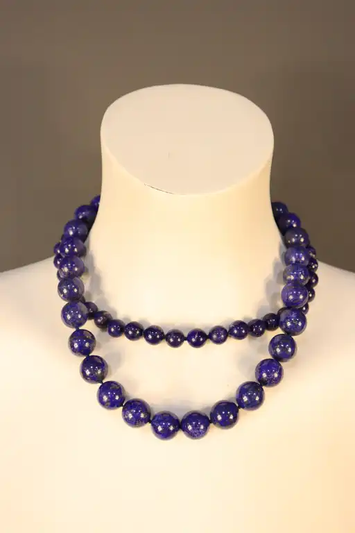 Lot deux colliers de perles de lapis lazuli, l'un comprenant 28 perles de 14 mm de diamètre.