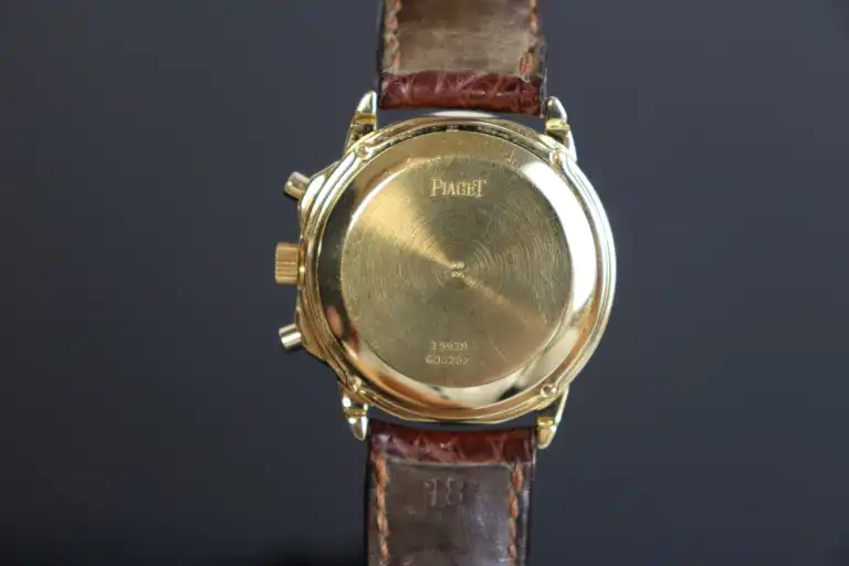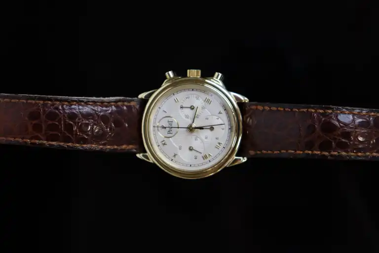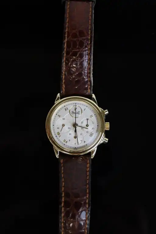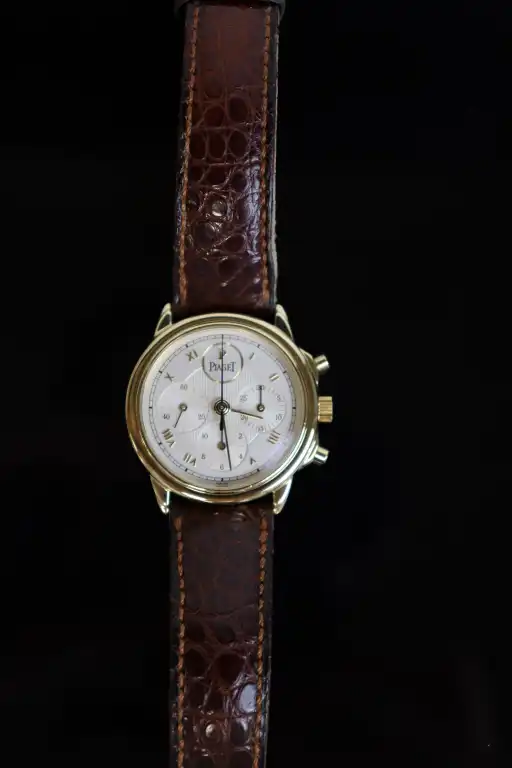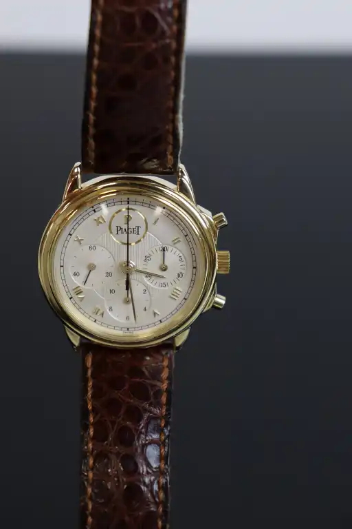 PIAGET. Collection "Gouverneur", référence 15978. Montre Chronographe en or jaune 18K (750), cadran rond à fond argenté, chiffres romains dorés appliqués, 3 compteurs dont trotteuse à 9h, mouvement mécanique à remontage manuel (calibre 1874P, base Lémania : signé et numéroté).