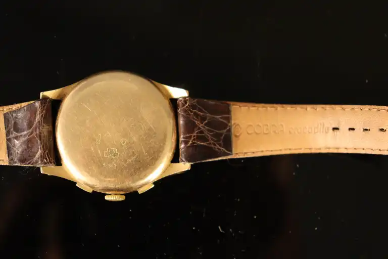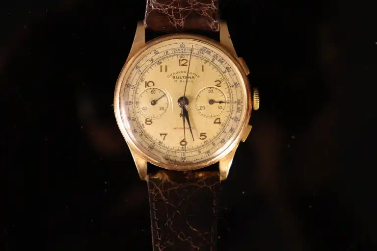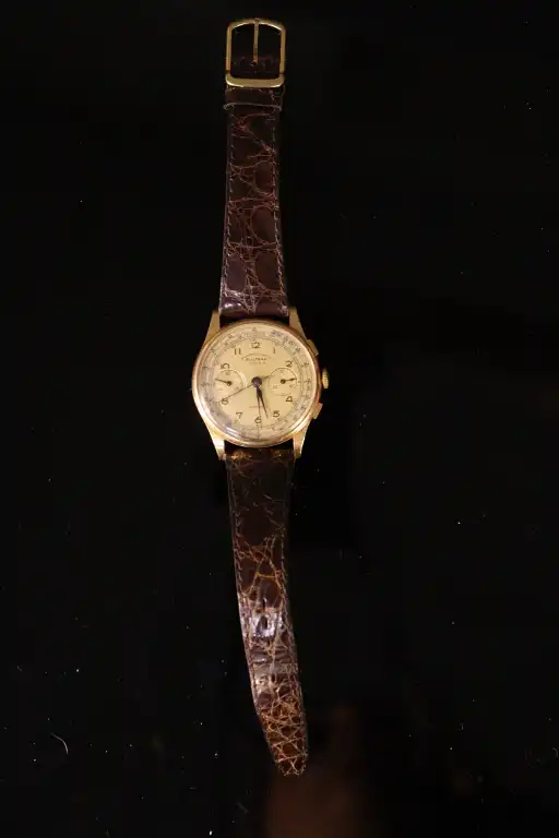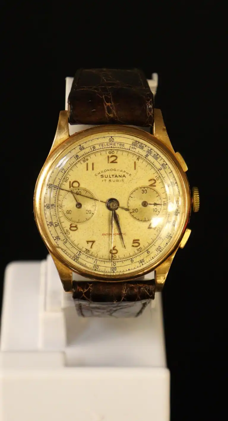 SULTANA. Montre bracelet d'homme chronographe à boîtier en or jaune 18 K (750) Le cadran rond à fond champagne signé, à chiffres romains et deux compteurs. Mouvement mécanique à 17 rubis. Bracelet postérieur en cuir brun à boucle en métal doré. Poids brut : 44.83 g