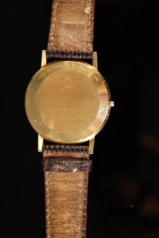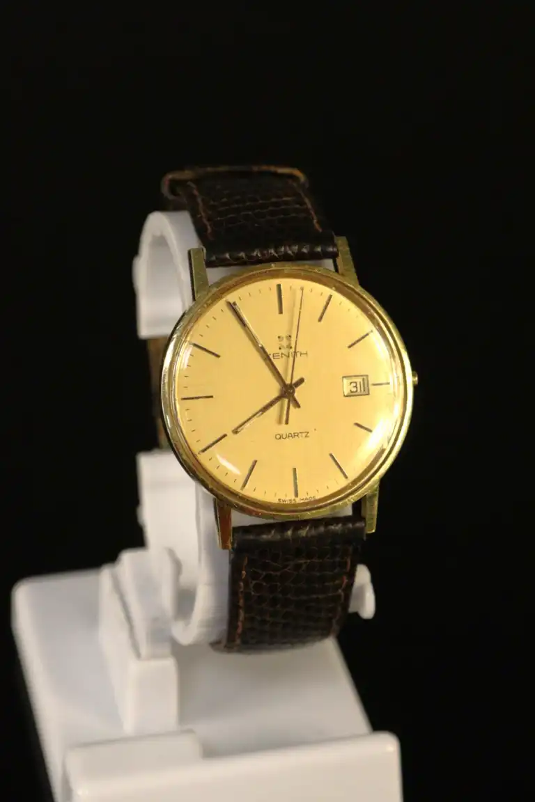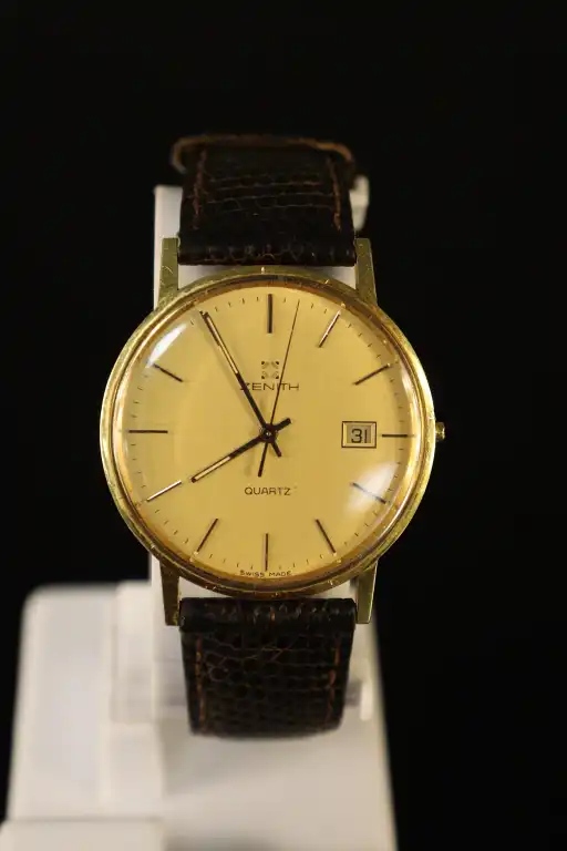 ZENITH. Montre pour homme en or 18 K (750). Mouvement à quartz. Poinçons hiboux. Non fonctionnelle, manque le repoussoir. Poids brut : 18 g
