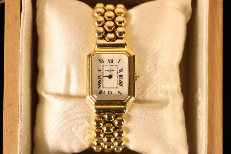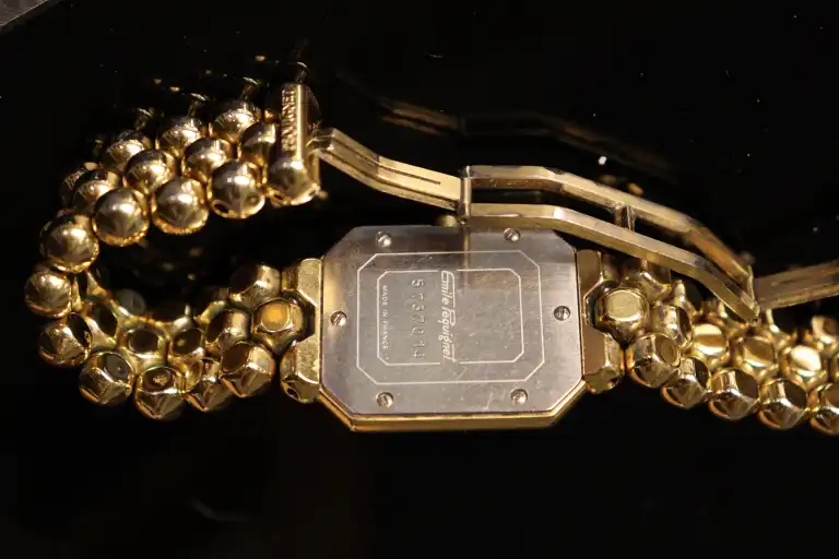 Emile PEQUIGNET. Montre bracelet de dame en métal doré à boîtier octogonal, le cadran signé, à chiffres romains sur fond blanc. Bracelet à maillons articulés et boucle déployante. Le dos signé et numéroté. Mouvement à quartz.