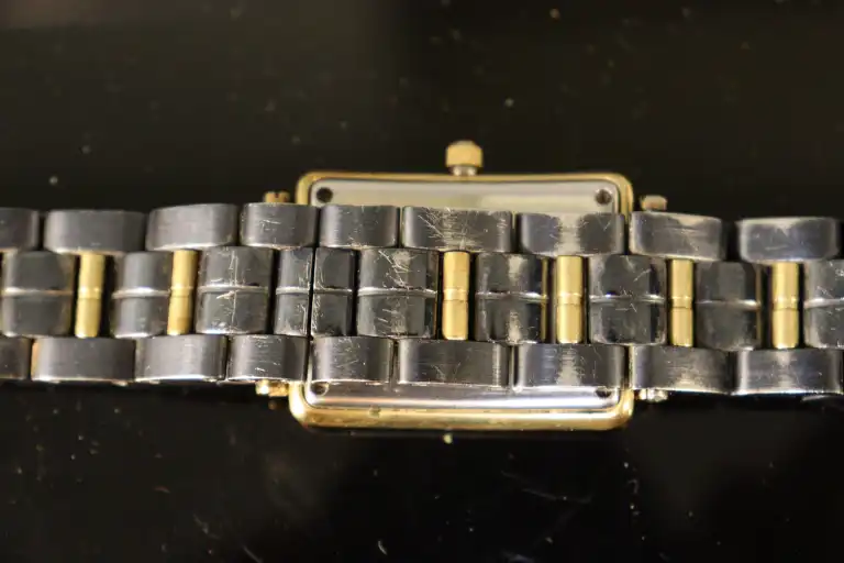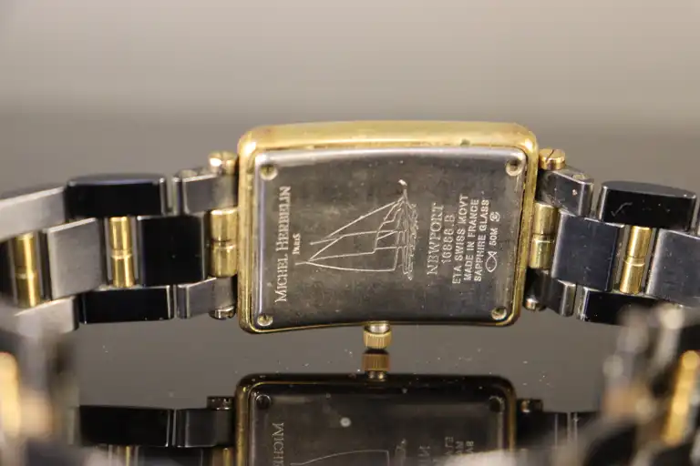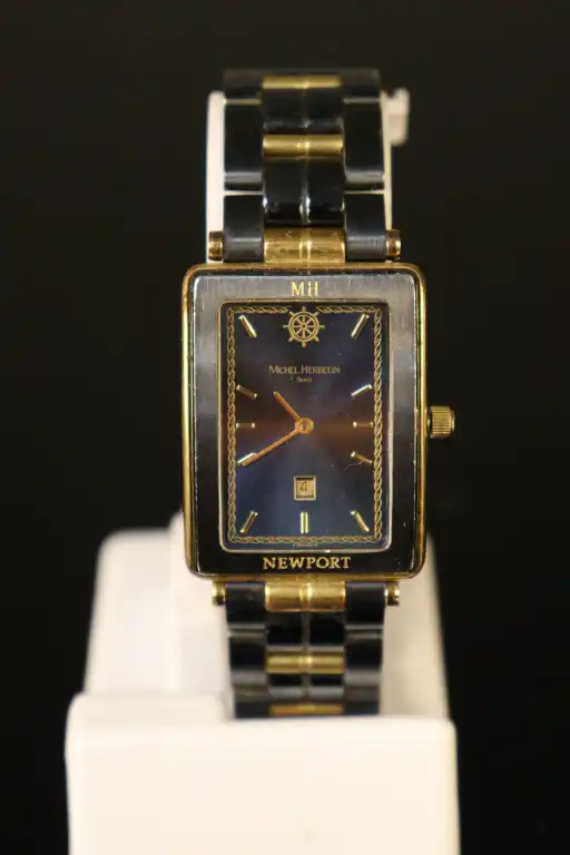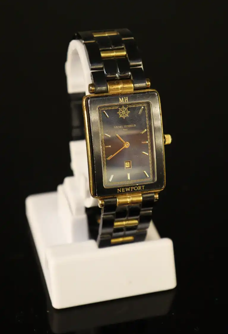 Michel HERBELIN. Modèle Newport. Montre bracelet d'homme en acier gris et doré à boîtier rectangulaire. Le cadran signé, index à bâtons, guichet dateur à 6h. Mouvement quartz,saphir glass, étanche 50 m. Dos signé et numéroté. Bracelet à maillons articulés.