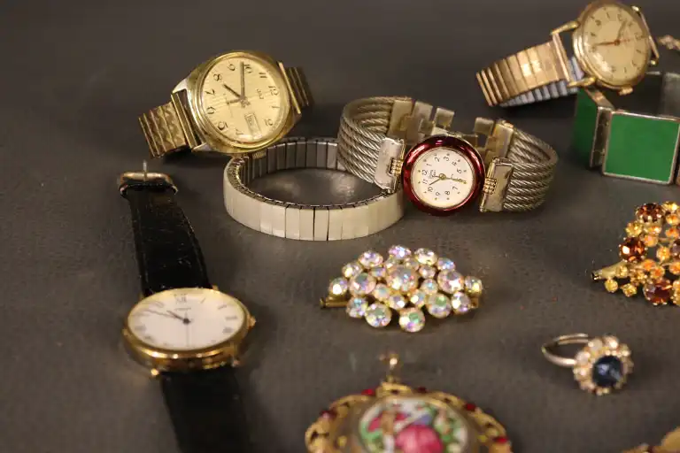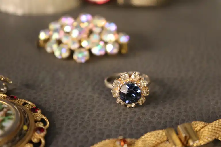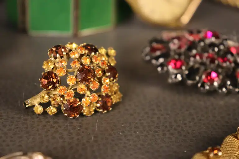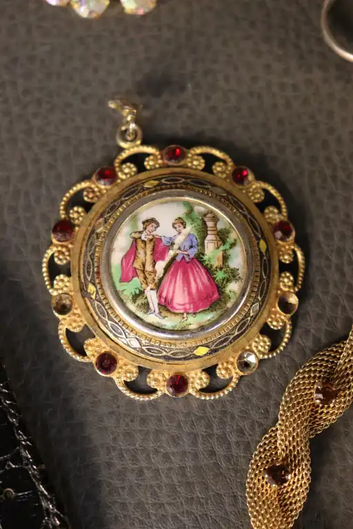 - Bijoux fantaisie : 1 bague, 2 colliers dorés, 2 bracelets, 1 pendentif et 3 broches. (Quelques manques)