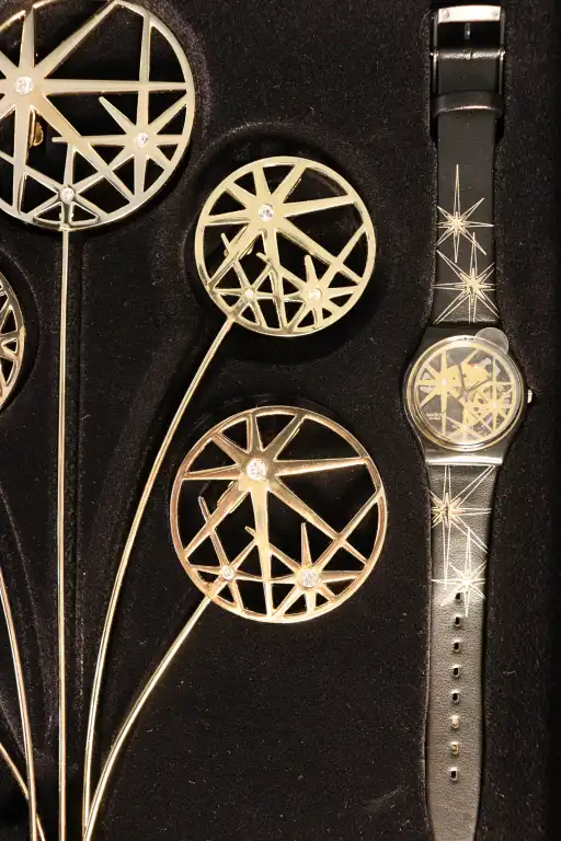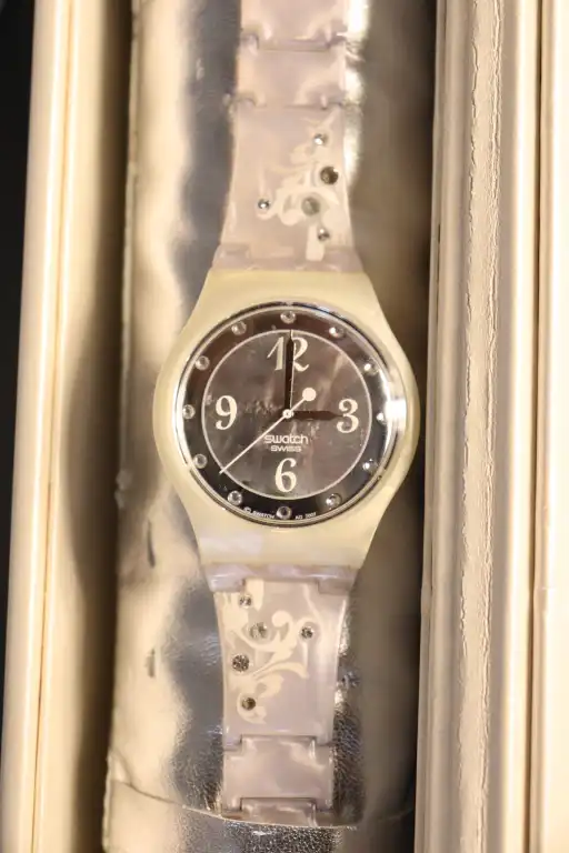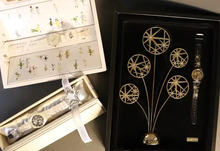 SWATCH. Lot de trois montres avec coffret en édition limitée (numéroté), comprenant : - WINTER DAY. Montre nacrée blanche et un bracelet étoile, 2007, avec certificat de garantie ;