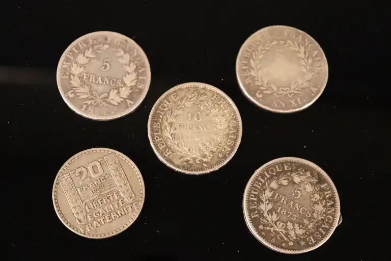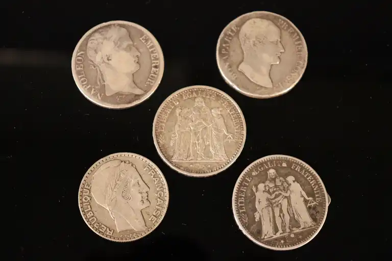 Un lot de cinq pièces : 2 Napoléons, une pièce de 10 francs de 1966, une pièce de 20 francs de 1933 et une pièce transformée en couteaux de 5 francs de 1873.