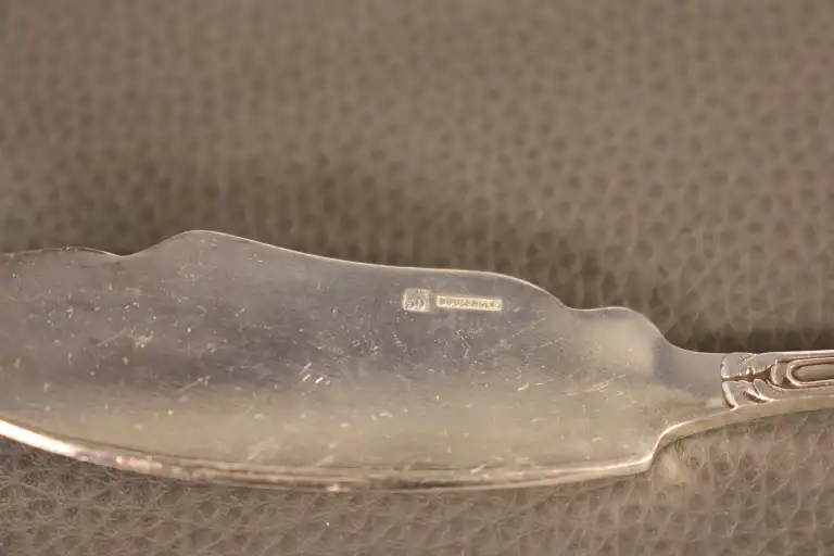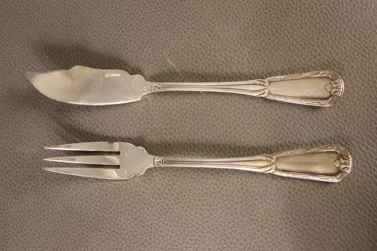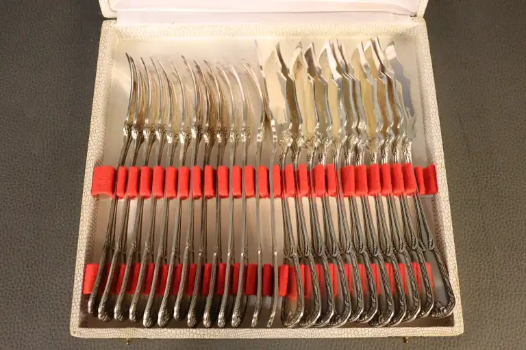 BOULENGER. Douze couverts à poisson en métal argenté à décor de filets feuillagés. Avec coffret.