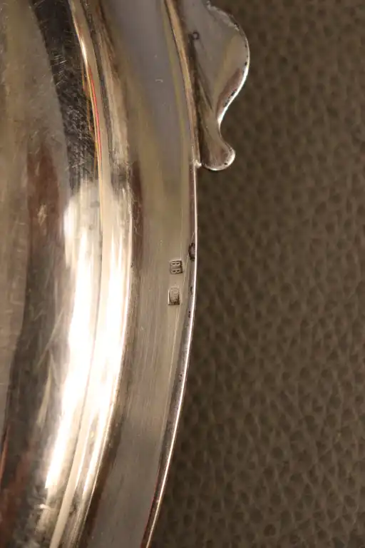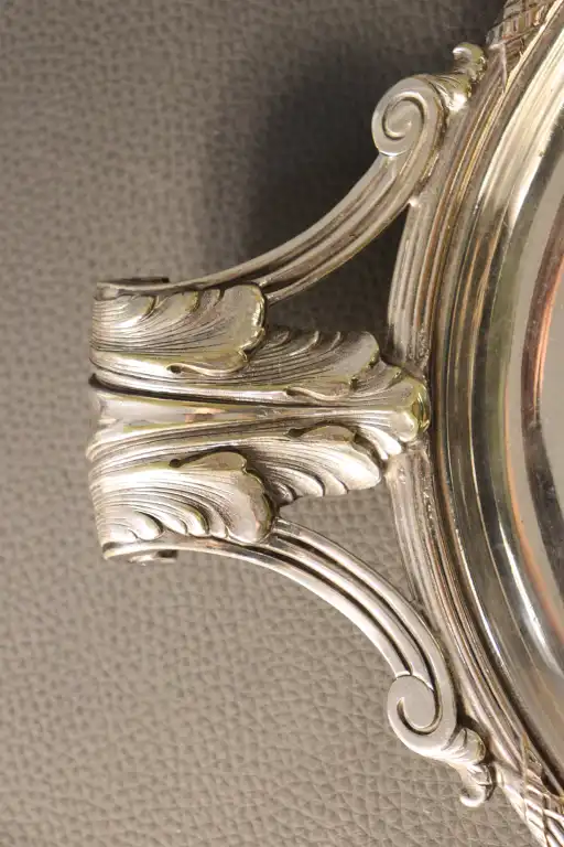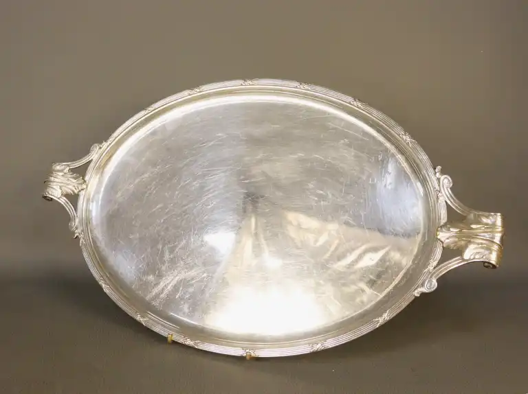 Grand plat ovale en métal argenté à deux prises latérales à motif de feuillages et enroulements. L. : 57 cm
