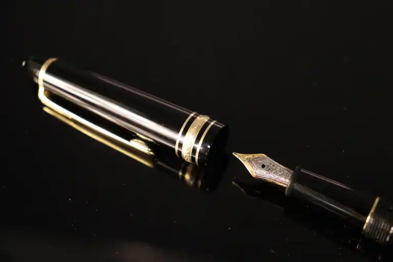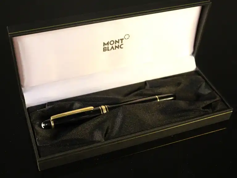 MONTBLANC. Stylo plume modèle Meisterstuck en résine noire et attributs en métal doré. La plume en or bicolore 18 K (750).