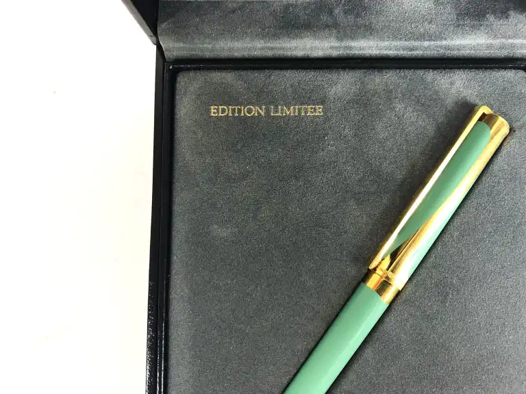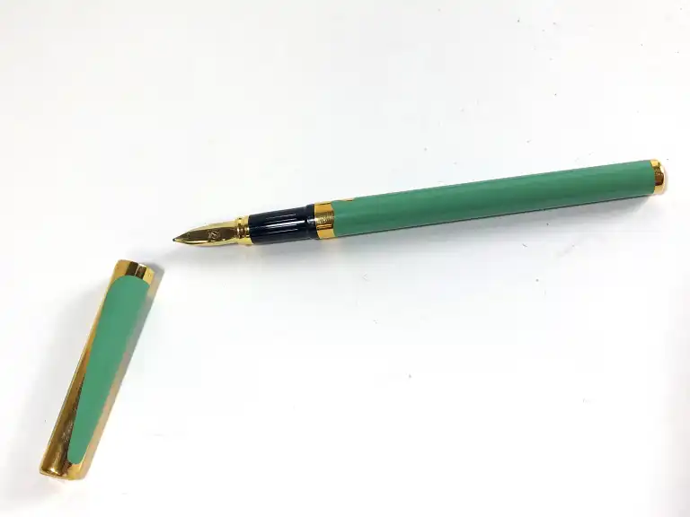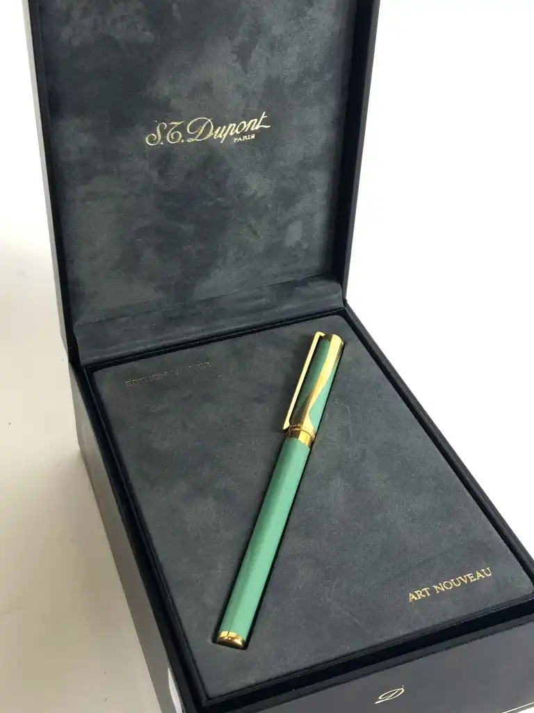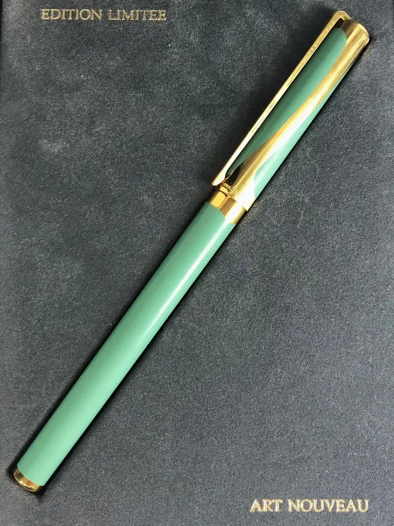 ST DUPONT. Modèle Art Nouveau. Stylo plume plaqué or et laque de Chine verte avec décor d'arabesques. La plume en or jaune 18 K (750) moyenne. Remplissage par cartouche ou convector. Edition limitée. Numéroté 1347 / 4000.
