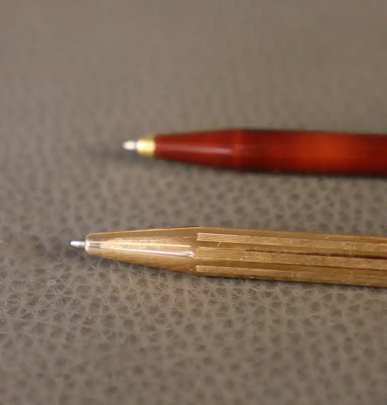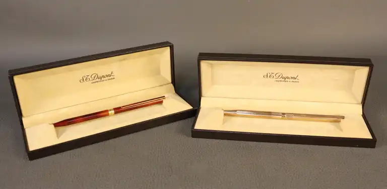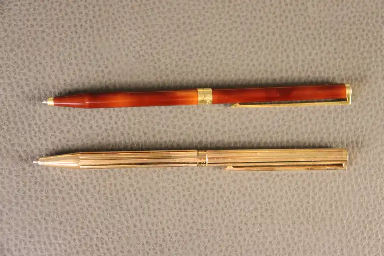 ST DUPONT. Lot de deux stylos bille, l'un en laque de Chine ambrée et l'autre en métal doré à fines rainures. Chacun numéroté.