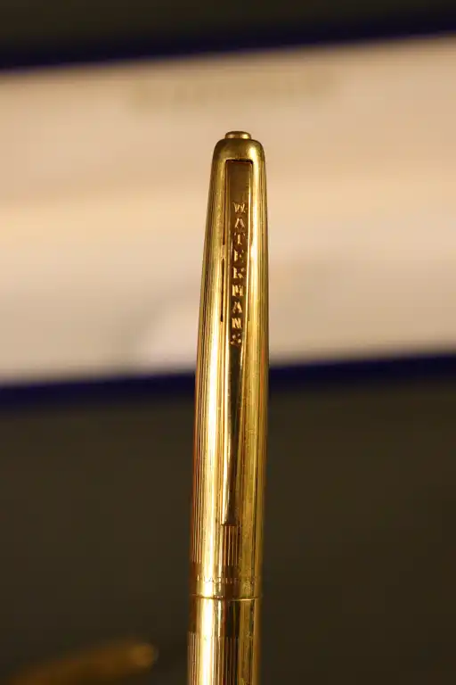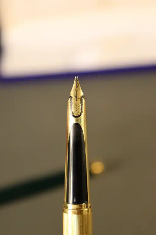 - Stylo plume en métal doré à fines cannelures. La plume en or jaune 18 K (750)
