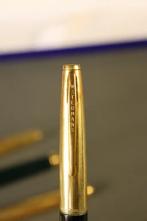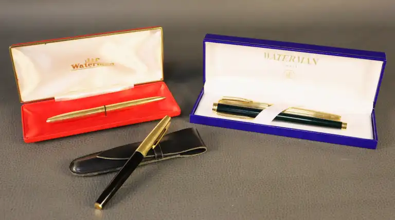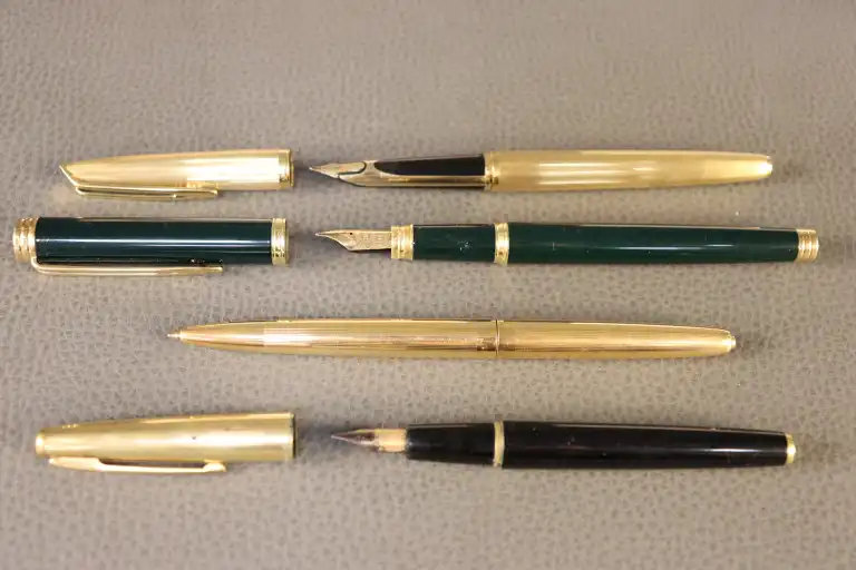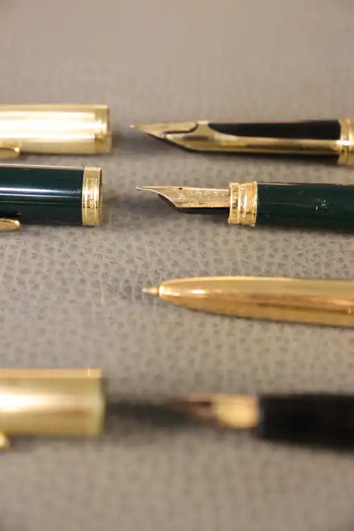 WATERMAN. Lot de quatre stylos : - Stylo plume en laque verte et attributs en métal doré. La plume en or jaune 18 K (750)