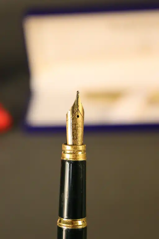 - Stylo plume en résine noire et capuchon en métal doré. La plume en or jaune 18 K (750)