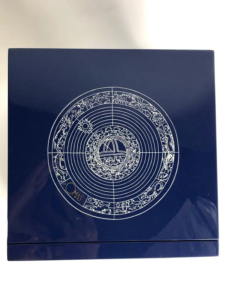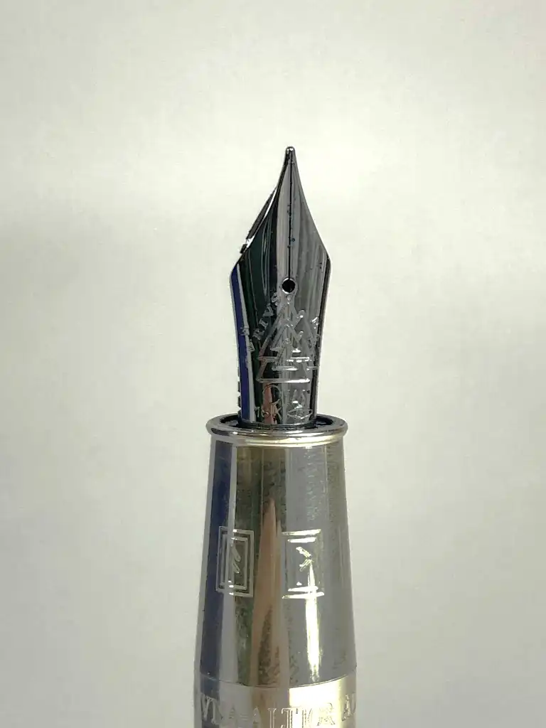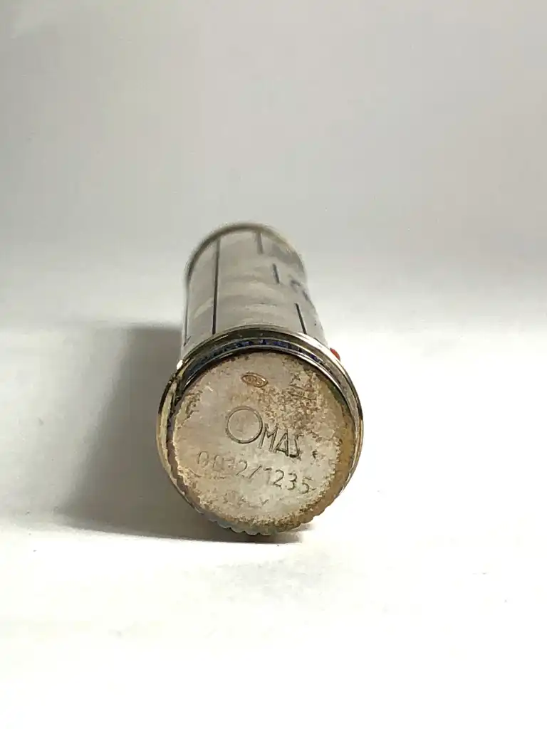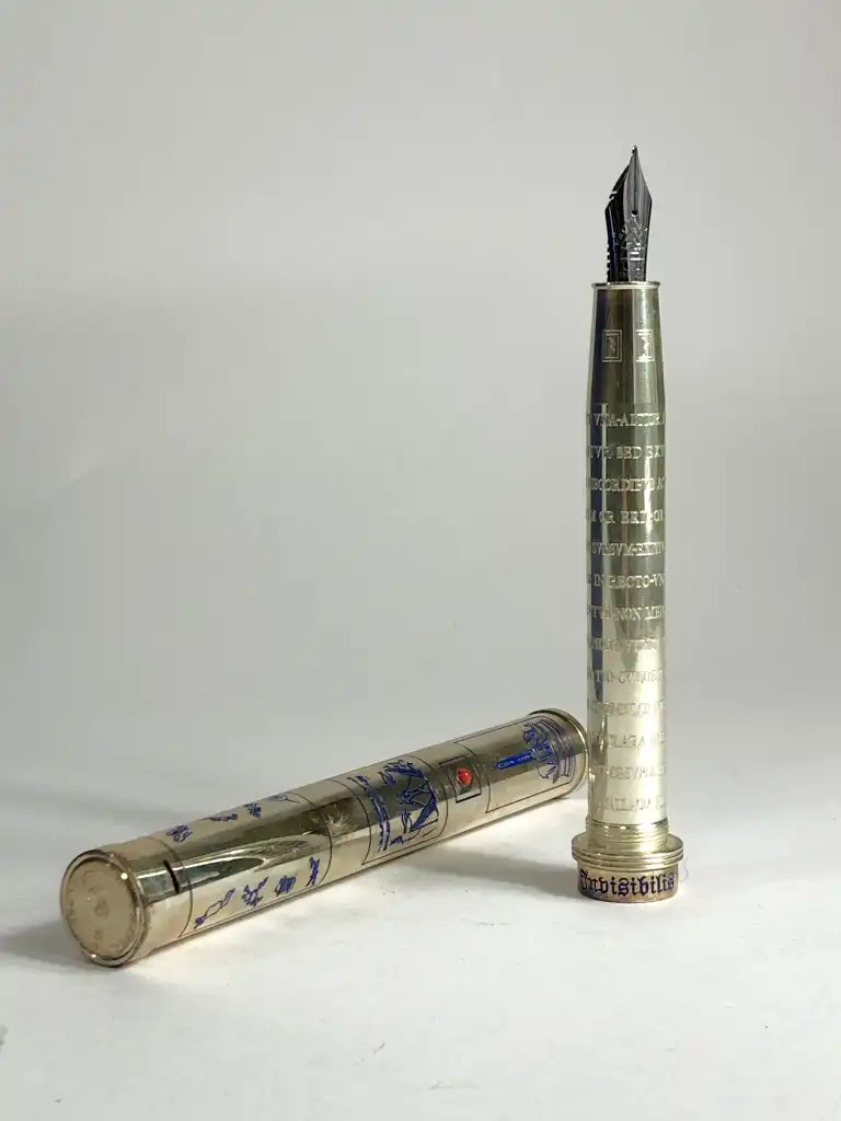 OMAS. Modèle Invisibilis. Stylo plume en argent massif 925. Plume en or gris 18 K (750), moyenne. Le capuchon à décor gravé et émaux bleu représente cinq images symboliques ésotériques. Le corps est gravé de runes. Remplissage à réservoir.