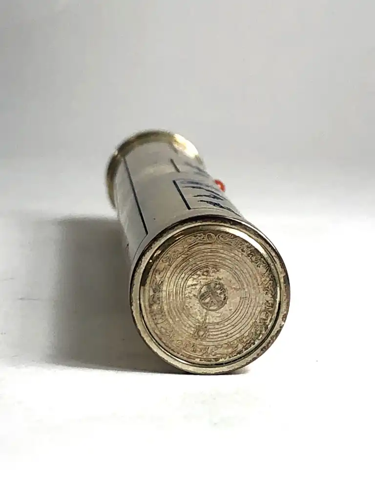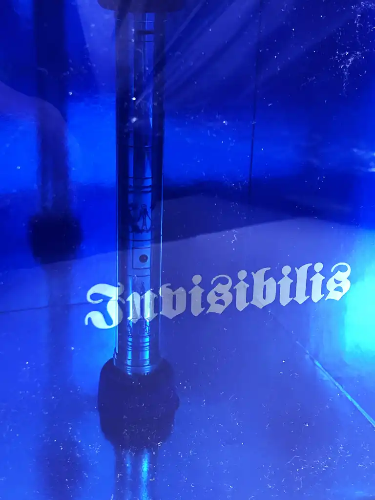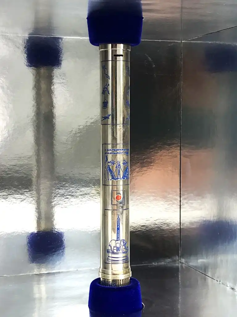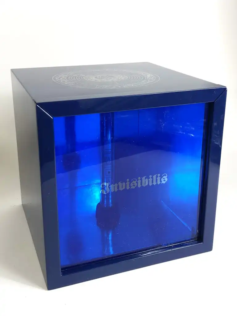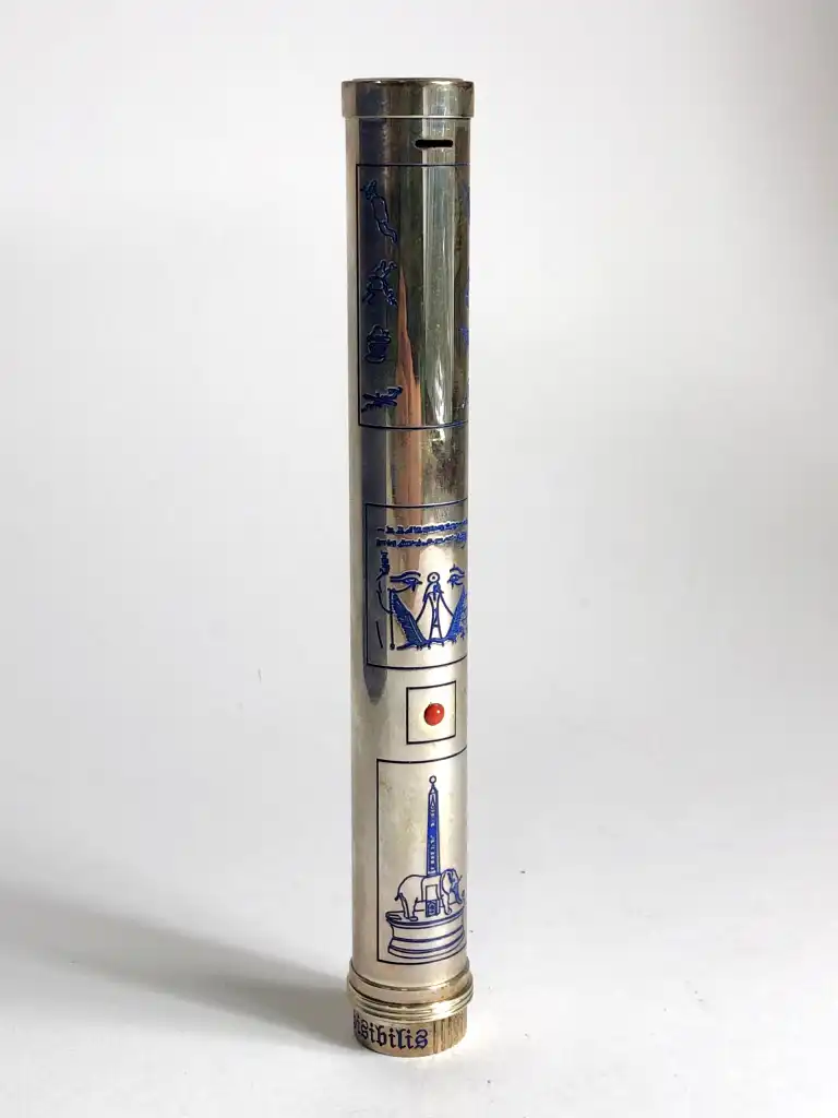 OMAS. Modèle Invisibilis. Stylo plume en argent massif 925. Plume en or gris 18 K (750), moyenne. Le capuchon à décor gravé et émaux bleu représente cinq images symboliques ésotériques. Le corps est gravé de runes. Remplissage à réservoir.