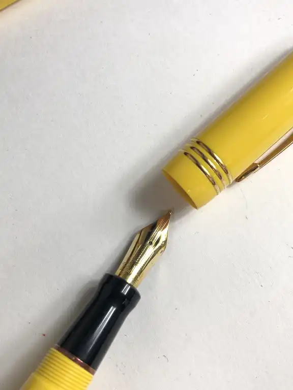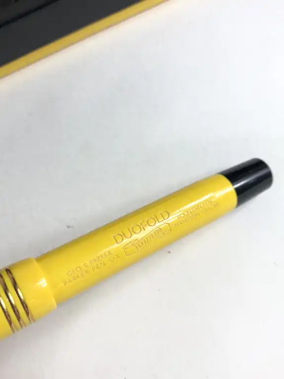 PARKER. Série Mandarin. Modèle Duofold. Stylo plume en résine jaune, les attributs en métal doré. La plume en or jaune 18 k (750). Remplissage à piston. Edition limitée. Numéroté 3375 / 10000.