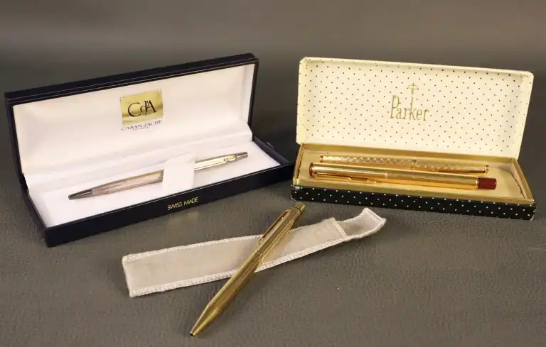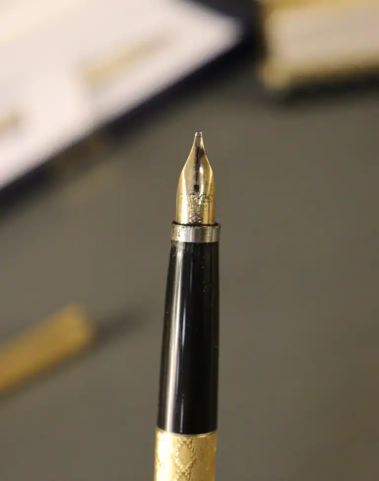 - PARKER. Stylo plume en métal doré et résine bordeaux.