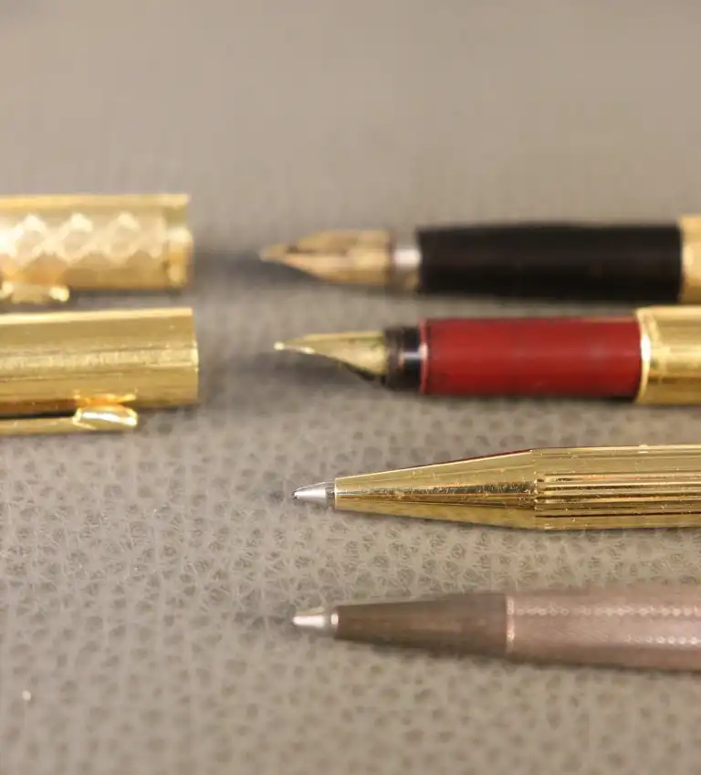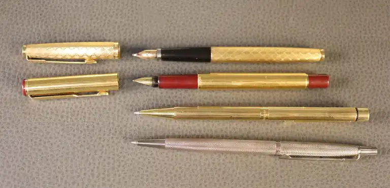 Lot de quatre stylos : - PARKER. Stylo plume en métal doré à motif de losanges sur fond guilloché. La plume en or jaune 18 K (750).