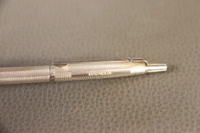 - CARAN D'ACHE. Stylo bille en métal argenté guilloché. Marqué : Maurolin. Dans son écrin d'origine.
