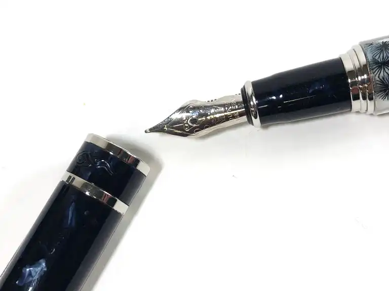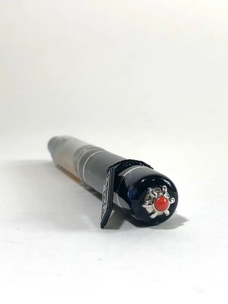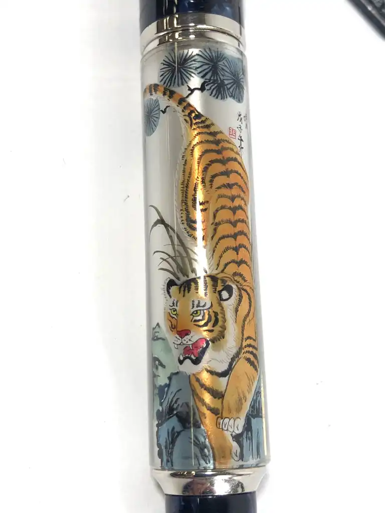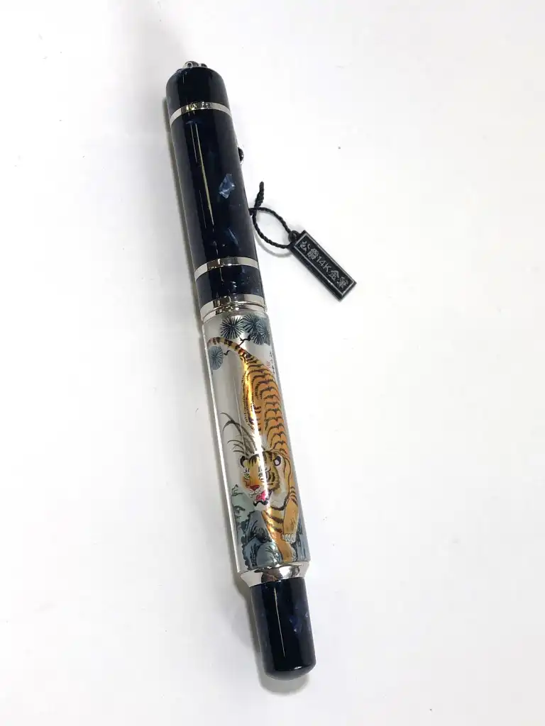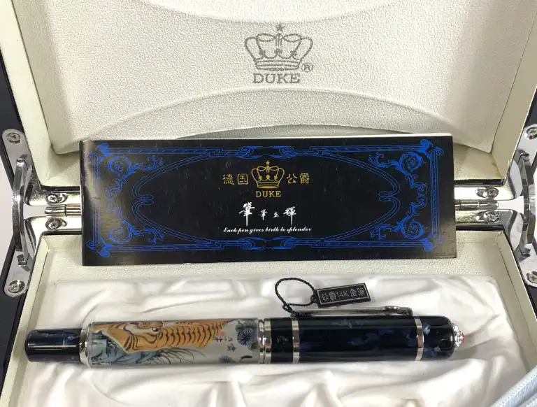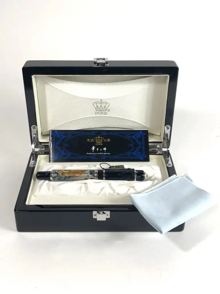 DUKE. Modèle tigre. Coffret comprenant un stylo plume. Corps en laque marbrée et décor de tigre. Plume en or jaune 14 K (580). Pierre orange à l'extrémité du capuchon. Edition limitée n° 0057.