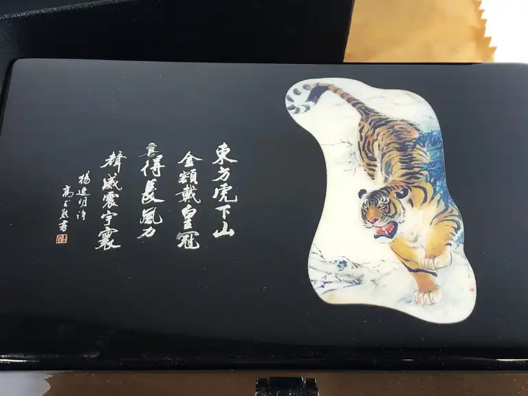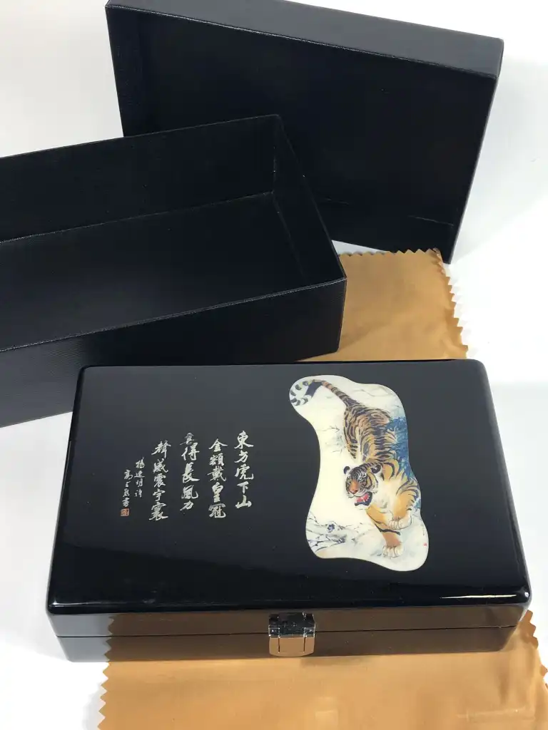 Dans son coffret d'origine en laque noire à décor de tigre, accessoires, livret et sur-boîte.