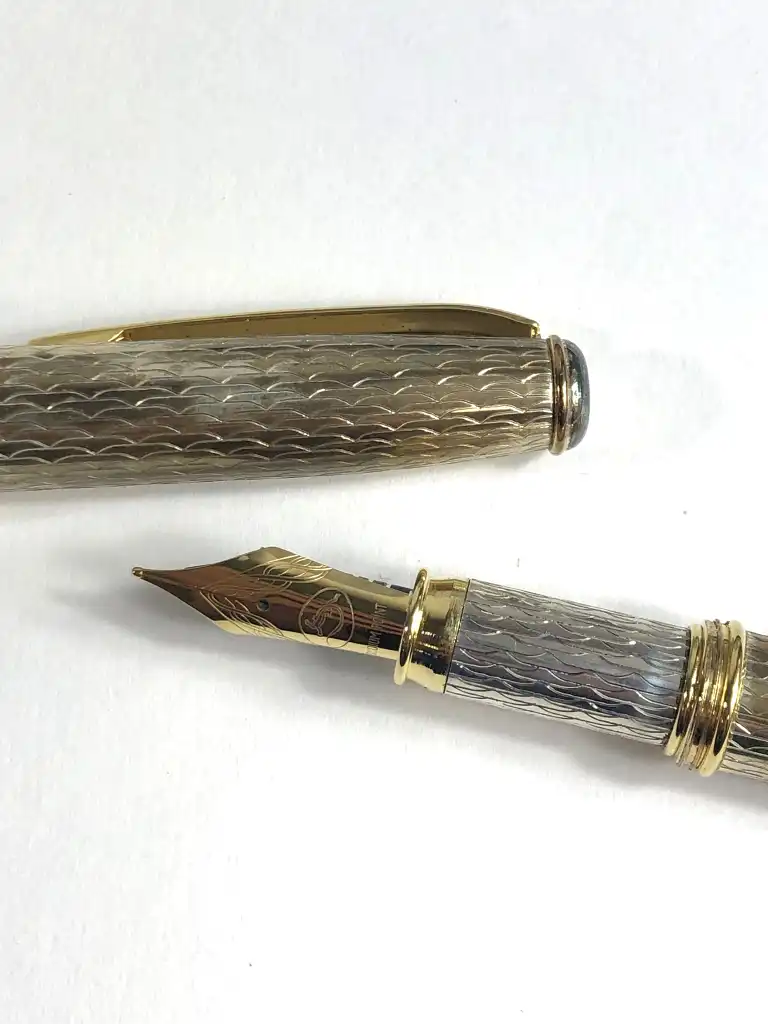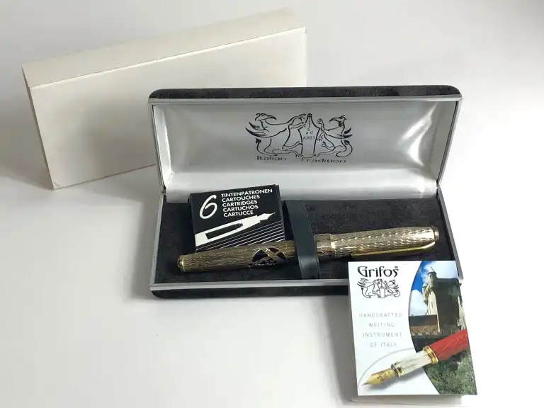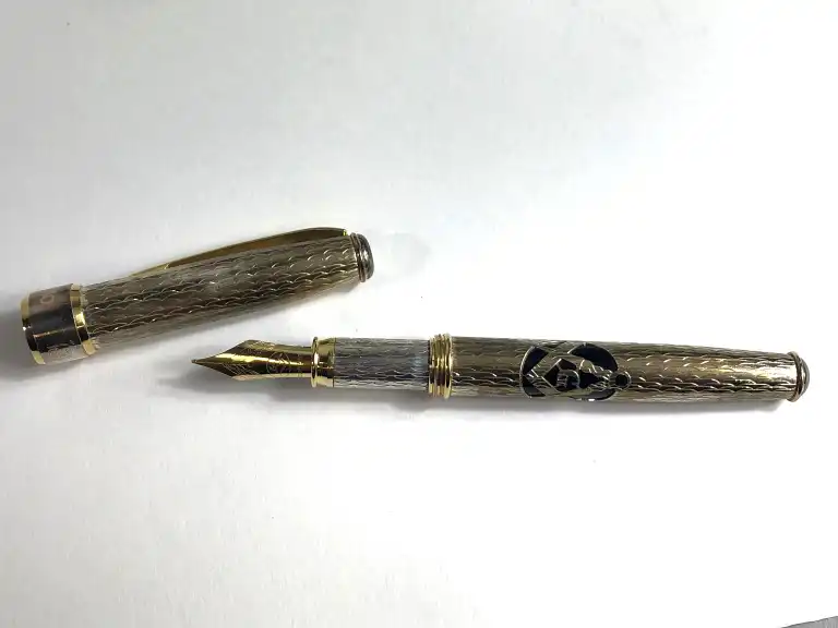 GRIFOS. Modèle Alius Ex Alio. Stylo plume avec corps et capuchon en argent 925. Fine vaguelette et symboles Franc-maçonniques. Avec sa boîte, accessoires et sur-boîte.