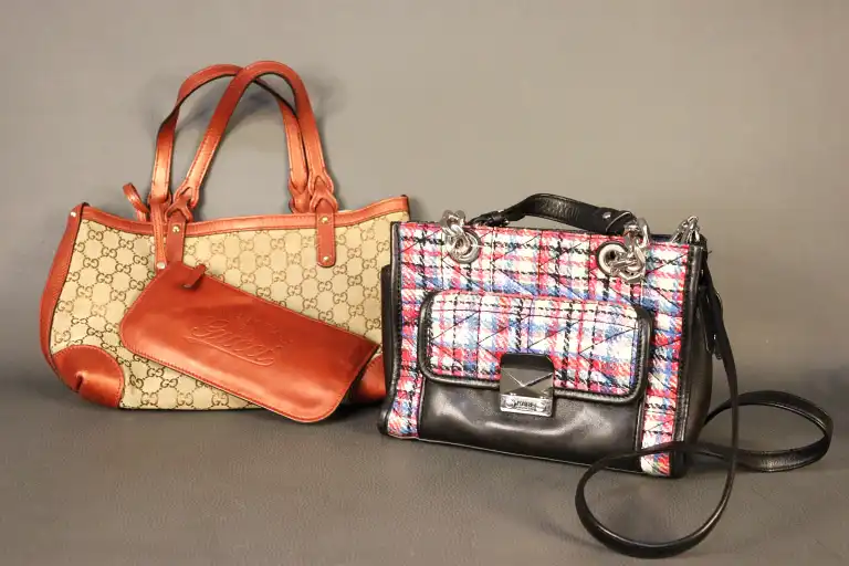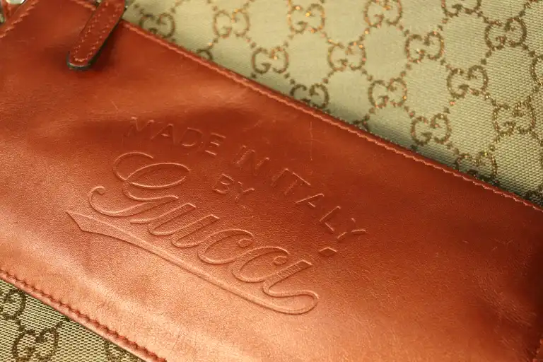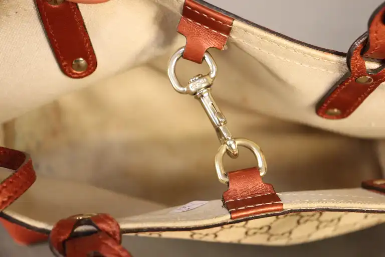 - GUCCI. Cuir marron et toile monogrammée avec pochette intégrée (quelques usures du cuir dessous).