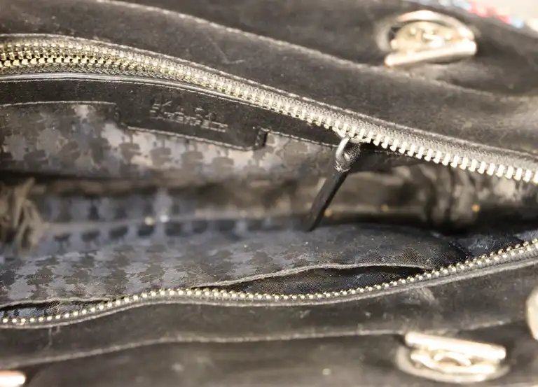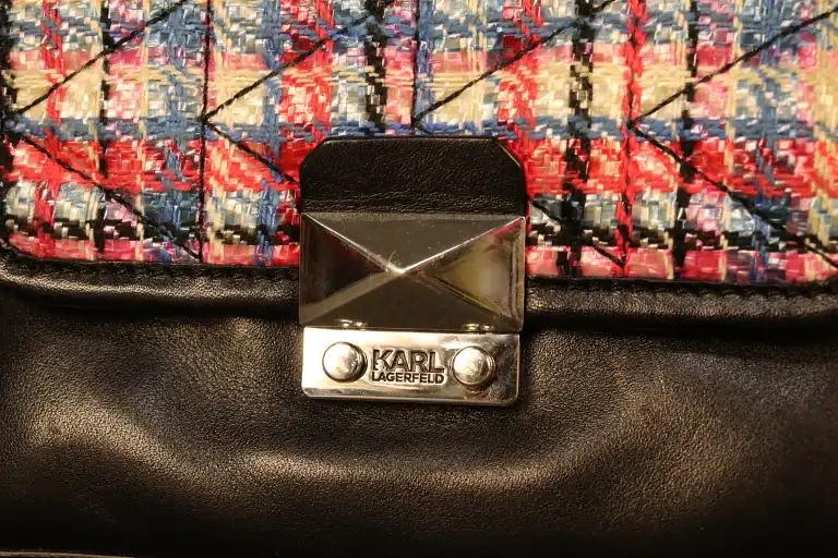 Lot de deux sacs à main avec bandoulière comprenant : - KARL LAGERFEL. Cuir noir et tweed rose et bleu.