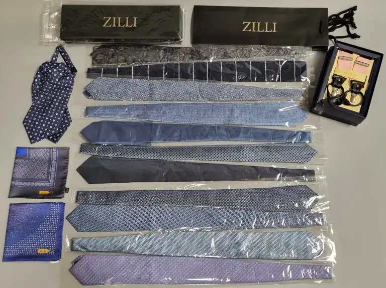 ATELIER F&B. Lot de douze cravates, une paire de bretelles. On joint ZILLI. Deux pochettes en soie.