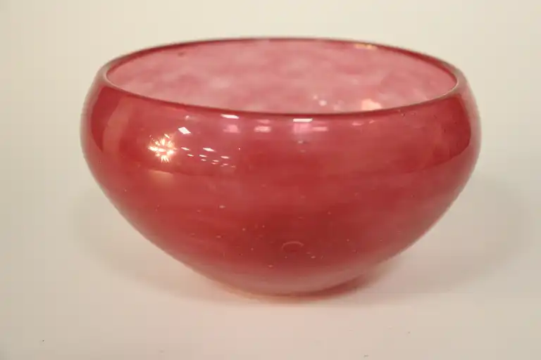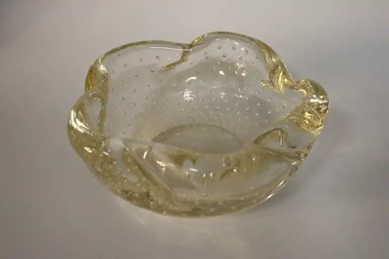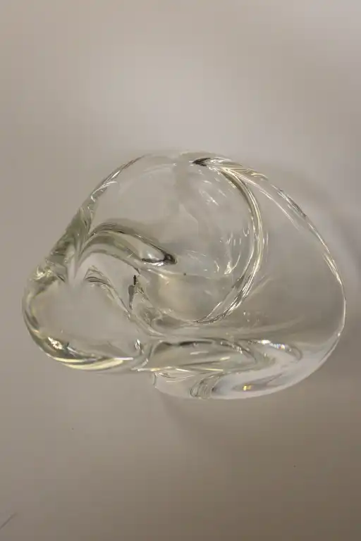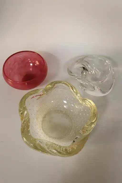 On joint : deux vide- poches en verre moulé, dont un rose rond et un triangulaire.